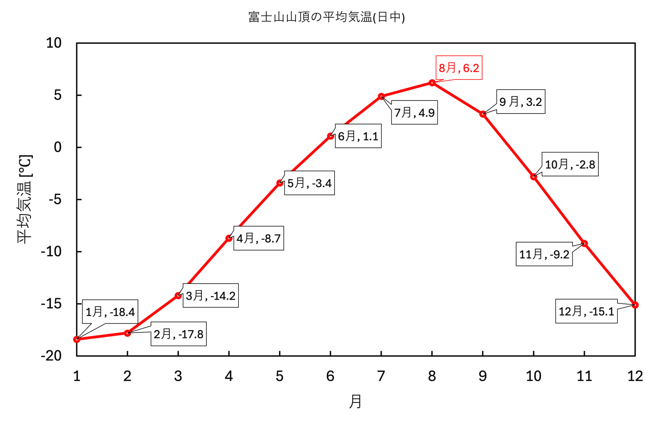 これを考慮すると平地で30℃の場合、登山口である五号目で20℃前後、山頂では10℃を下回ることになる。